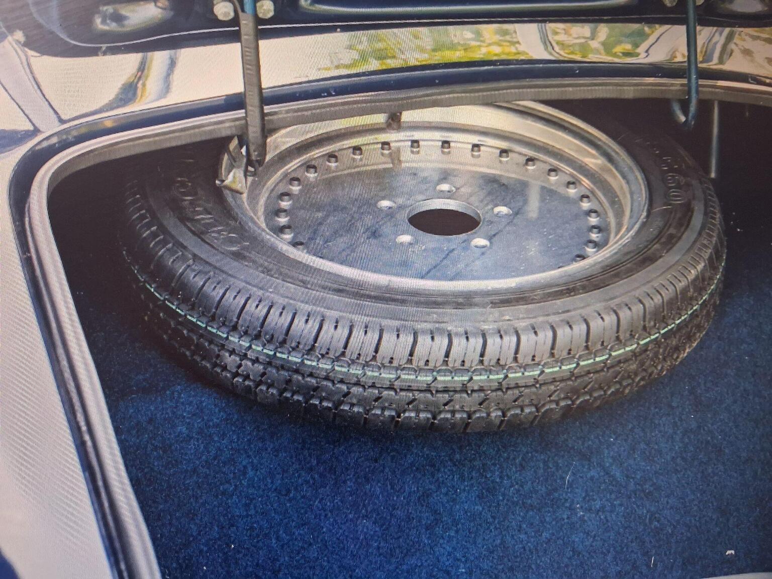The cabin features a full blue leather interior piped in grey, with blue Triumph Spitfire seats reupholstered during the car’s build, and blue carpets piped in grey.